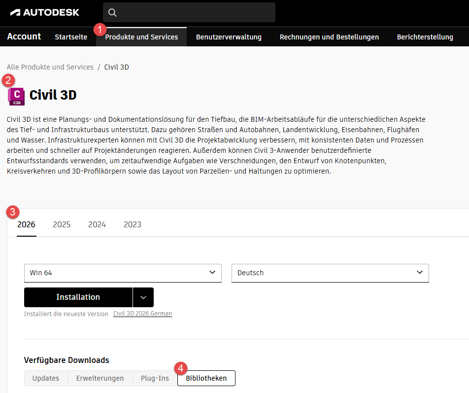 Die Verteilung des Country Kits erfolgt analog zur Version 2025. Für diese wurde im Autodesk Konto unter den verfügbaren Downloads die zusätzliche Kategorie ‚Bibliotheken‘ ergänzt.