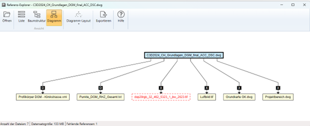 Der Referenz Explorer zeigt Ihnen vor dem Upload in die ACC die Struktur Ihres Projektes mit allen Referenzen an. Auch «versteckte Referenzdateien» (z.B. txt-Datei eines Civil 3D DGMs, xml eines 3D-Profilkörpers) oder fehlende Dateien (hier: Luftbild) werden übersichtlich angezeigt.