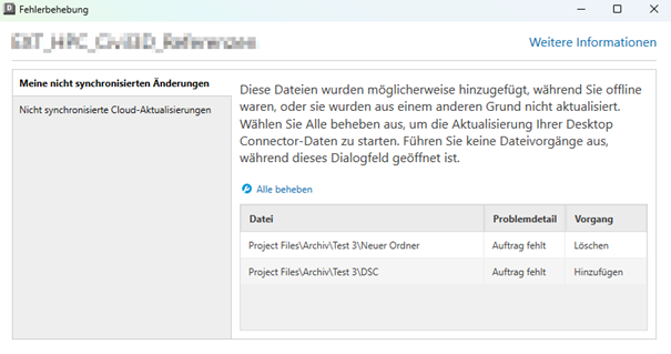 Das Werkzeug zur Fehlerbehebung hilft Ihnen, nicht synchronisierte Dateien in einem Autodesk Docs Projekt zu identifizieren und zu überprüfen, ob Aktualisierungen aus der Cloud vorliegen, die noch nicht auf Ihren Arbeitsbereich angewendet wurden.