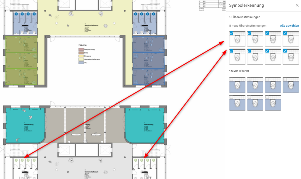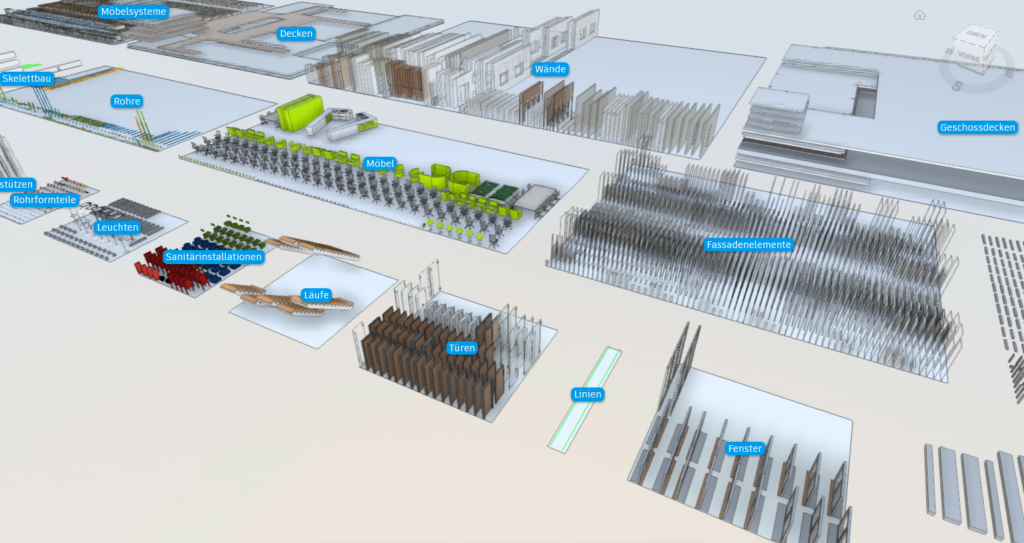 Die Informationen aus den Plänen oder Modellen (Längen, Flächen, Anzahl etc.) können ermittelt und bei Bedarf kombiniert und erweitert werden, wobei das Tool Erleichterungen wie eine Symbolerkennung in 2D oder eine visuelle Aufgliederung in Kategorien in 3D bietet.