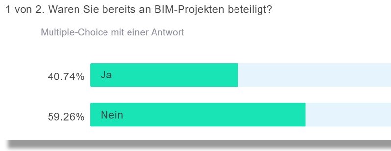 Um einen Eindruck vom Wissens- und Erfahrungsstand der Teilnehmer zu bekommen, wurden im Verlauf des Webinars verschiedene Umfragen durchgeführt – mit äußerst interessanten Ergebnissen. So stellte sich beispielsweise heraus, dass knapp 60 Prozent der Teilnehmer noch nie an einem konkreten BIM-Projekt beteiligt waren.