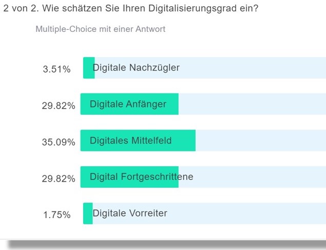Auch die Einschätzung des eigenen Digitalisierungsgrads belegt, dass beim Thema BIM noch jede Menge Luft nach oben ist. So bezeichnete sich rund ein Drittel der Teilnehmer als „Nachzügler“ bzw. „Anfänger“. Ein weiteres Drittel liegt in punkto BIM-Know-how im Mittelfeld. Und nur ein Drittel betrachtet sich digital als „Fortgeschritten“ oder „Vorreiter“. Wobei Letztere nicht einmal 2 Prozent ausmachen.
