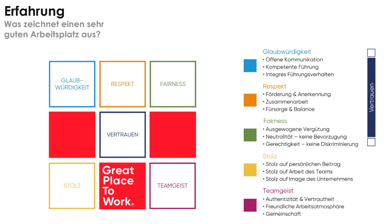 Great Place to Work® ist ein international anerkanntes Forschungs- und Beratungsinstitut, das Unternehmen in mehr als 60 Ländern dabei unterstützt, eine attraktive und erfolgreiche Arbeitsplatzkultur zu entwickeln. Die Zertifizierung basiert auf einer anonymen Mitarbeiterbefragung und einer Kulturanalyse, bei der zentrale Kriterien wie Glaubwürdigkeit, Respekt, Fairness, Stolz und Teamgeist bewertet werden.
