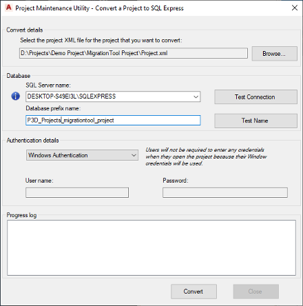 Wählen Sie anschließend das zu migrierende Projekt und den Namen des SQL-Servers aus. Das Datenbank-Präfix wird automatisch ausgefüllt. Der PC-Name, auf dem das Tool ausgeführt wird, wird hier vor den Projektnamen gehängt. Daher ist es sinnvoll, das Datenbank-Präfix vor der Migration zu editieren. Typischerweise nimmt man hier den Projektnamen oder die Projektnummer. Der Name muss auf jeden Fall eindeutig sein und darf noch nicht in Verwendung sein. Daher kann man mit dem „Test Name“ Knopf prüfen lassen, ob der Name korrekt und eindeutig ist.