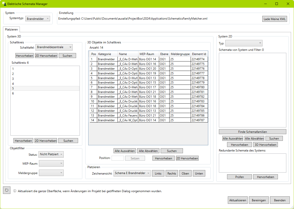 Für mehr Übersicht können die Objekte nach Status, MEP-Raum und Meldergruppe (bei Brandmelder) gefiltert werden. Nach der Objekt- und Zeichenansichts-Auswahl und die Ausrichtung, sind die assoziative 2D Schemafamilien automatisch platziert. Durch diese automatische Platzierung sparen Sie wertvolle Zeit. Durch die “Hervorheben”, “2D Hervorheben” und “Suchen“ Funktionen, können Sie präziser arbeiten, weil Sie jederzeit mühelos, schnell und bidirektional die 3D Elemente im Modell als auch die assoziative 2D Elemente in den Zeichenansichten finden können.