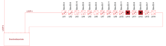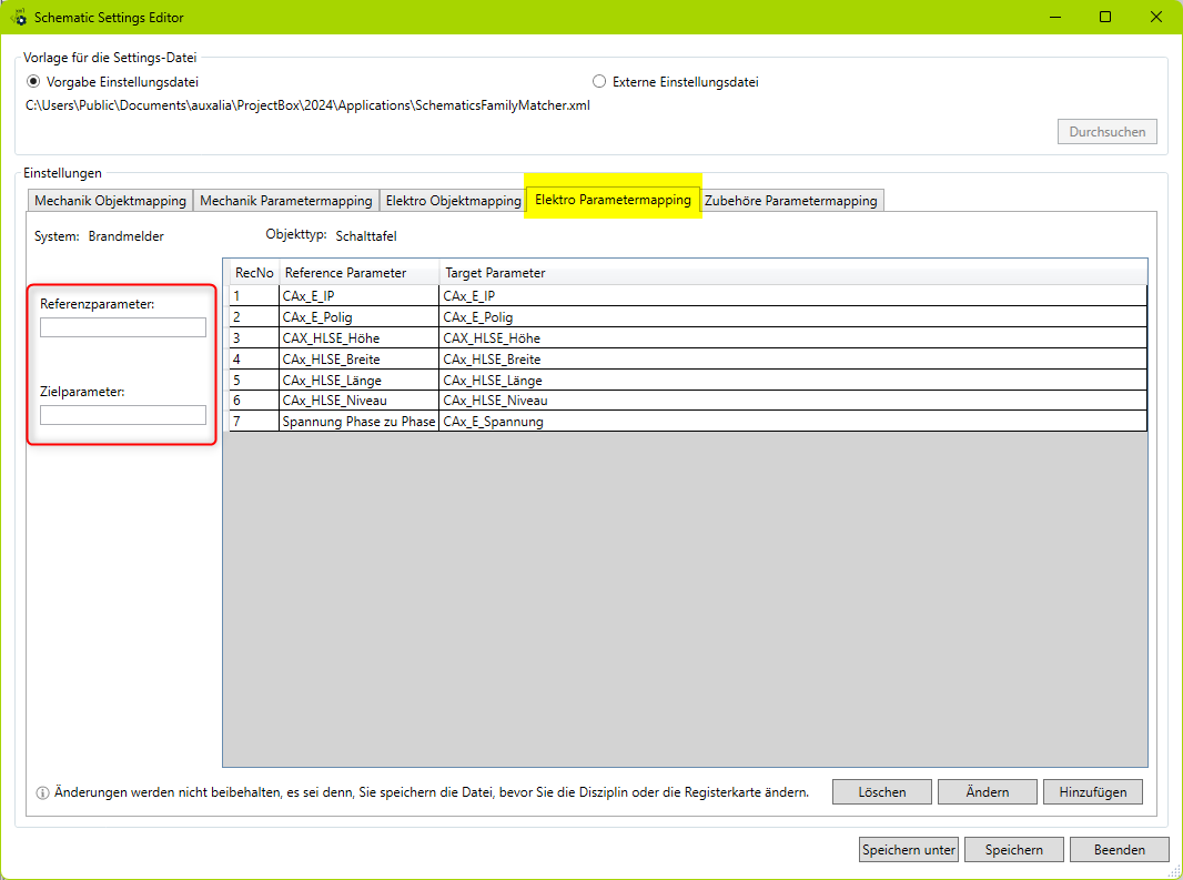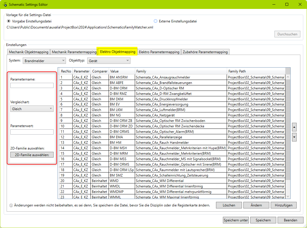Raumzugehörigkeit, Ebene, Stromkreis, Meldergruppe, Meldernummer, Schalttaffel und Name gehören zu den fixen Parametern, die von 3D auf 2D übertragen werden. Es können beliebig weitere Parameter zu der Liste hinzugefügt werden damit die Schemafamilien ggf. zusätzlich entsprechend beschriftet werden.