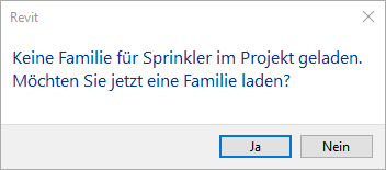 In der Revit Gebäudetechnik-Vorlage von Autodesk sind gar keine Familien implementiert, so dass den Anwender, sollte er versuchen, das Schaltfeld Sprinkler aus der Multifunktionsleiste Gebäudetechnik zu verwenden, folgende Meldung erwartet: