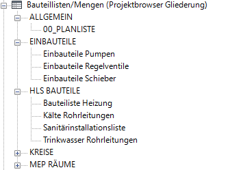 Nachfolgend der Auszug aus den vorhandenen Bauteillisten der Revit Gebäudetechnik-Vorlage von Autodesk aus dem Projektbrowser: