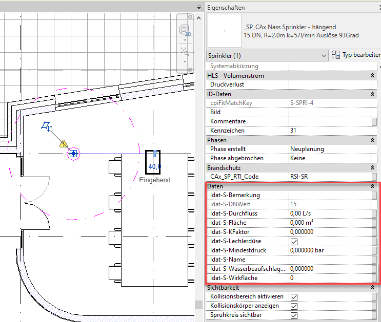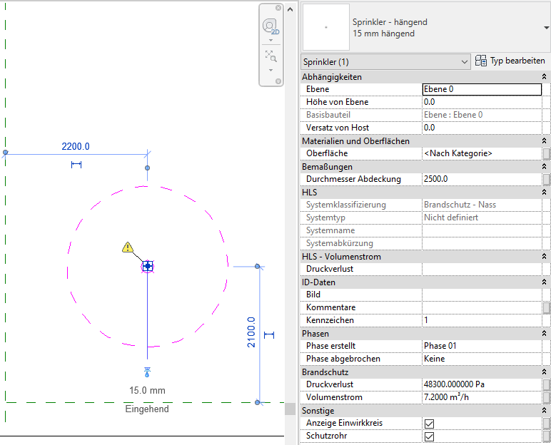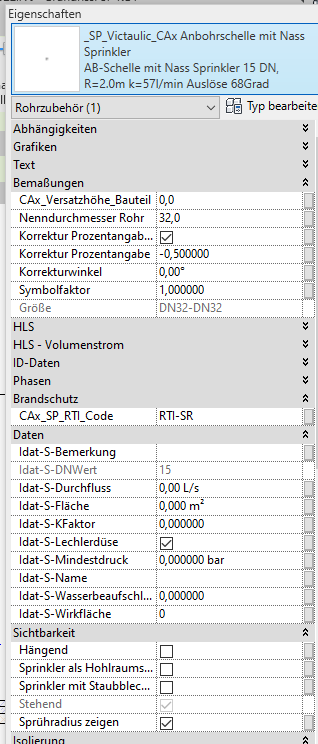 Ein weiterer Schwachpunkt beim Nutzen des Autodesk Content ist, dass die Sprinkler keine Parameter besitzen, um mit Satelliten-Programmen zur Sprinklernetz-Berechnung kommunizieren zu können.