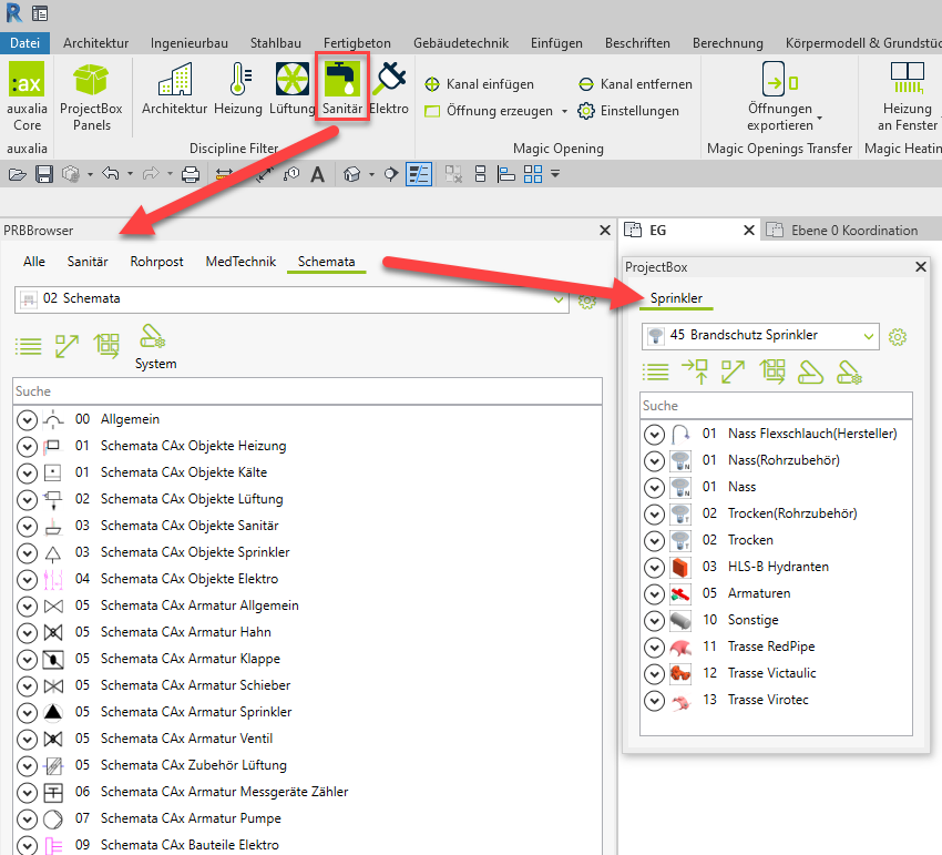 Komplett anders verhält es sich, sollten der Sprinklerplaner oder die ausführenden Unternehmen die Revit ProjectBox einsetzen. Man erhält dann zwar Familien und Funktionen aller TGA-Gewerke, kann aber die Darstellung des ProjectBox Browsers so individualisieren, dass man nur die Informationen zum eigenen Gewerk sieht.