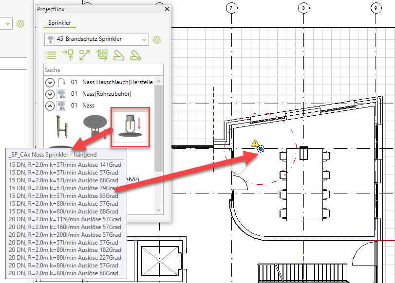 Dafür erhalten Anwender dann qualifizierte Sprinklerbauteile, die sie über die grafische Benutzeroberfläche direkt sehen. Diese können aus der ProjectBox Palette per Drag-and-Drop in das Projekt gezogen oder über eine Raumaufteilung einfach platziert werden.