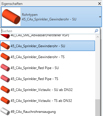 Des Weiteren sind für die Sprinkler-Familie nur vier unterschiedliche Typen umgesetzt, die sich ausschließlich mit der Anschlussdimension und dem Schutz des Kopfes befassen. Die Auslösetemperatur zum Bespiel ist in den Typ-Eigenschaften erfasst, so dass der Anwender selbst entsprechende Typen anlegen muss.