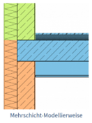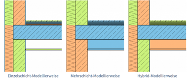 • Bei horizontalen Bauteilen wie Decken und Dächern wird oft die Hybrid-Modellierweise verwendet, um unterschiedliche Raumaufteilungen zu berücksichtigen; weitere Aufbauten in mehrschichtigen Systemen, z.B. ein Fußbodenaufbau Deckensysteme.