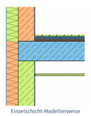 • Bauphysiker und Gebäudetechniker hingegen bevorzugen eine mehrschichtige Modellierung, um bautechnische Verbundsysteme zu berücksichtigen. Die Konstruktion des Wandtyps kann aus verschiedenen Schichten (Tragend, Nicht Tragend, Dämmung/Luftschicht) bestehen, denen Materialien zugeordnet werden können. Wenn diese eine Angabe zum Widerstand W und U-Wert besitzen, kann ein Gesamtwert für die thermisch wirksame Masse des Wandtyps berechnet werden.