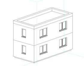 Das Testmodell – Mehrschicht-Modellierweise, die Fenster/Türen werden im Berechnungsmodell als Abzugsflächen erkannt. (Revit gbXML – SOLAR-COMPUTER Heizlastberechnung)