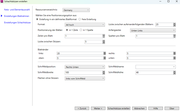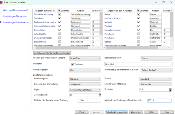 Abschliessend erfolgen Angaben und Einstellungen für die Schachtskizze, z.B. die Auswahl von Bestandteilen und die Festlegung von Schriftarten.