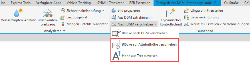 Die beiden Befehle können über die Mulitfunktionsleiste nur dann aufgerufen werden, wenn ein DGM vorhanden ist und ausgewählt wurde. Danach sind sie in der objektabhängigen Registerkarte, Gruppe DGM-Werkzeuge zu finden.