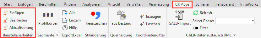 Zu finden sind die Befehle in der Registerkarte CK Apps in der Multifunktionsleiste. Dort kam eine neue Gruppe Baustellenarbeiten hinzu.