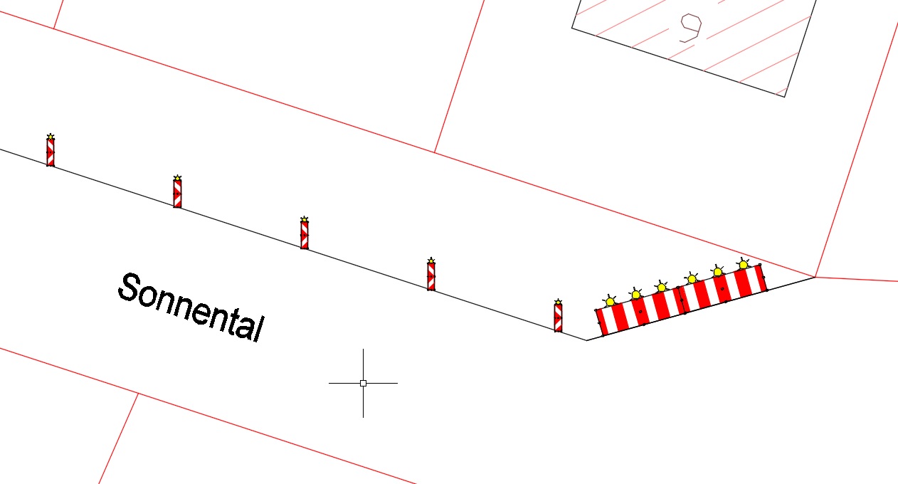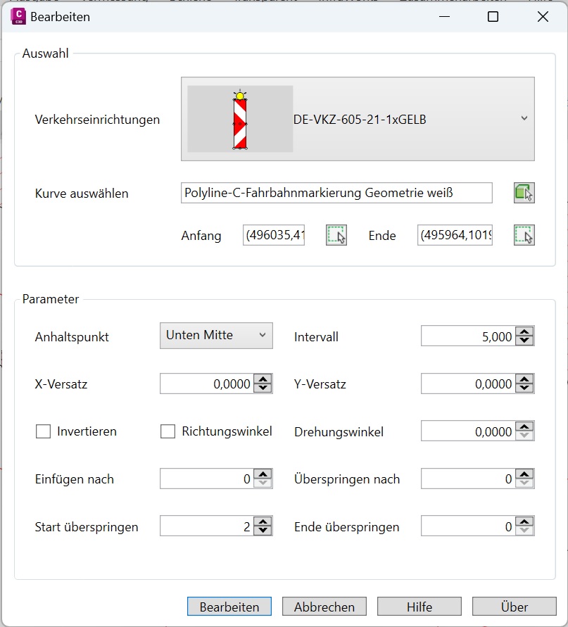 Mit dem Befehl Einfügen werden Baustellenabsicherungen wie beispielsweise Absperrgitter, Baken oder Verkehrsleitkegel in die Zeichnung eingefügt. Es sind eine Verkehrseinrichtung sowie eine Bezugslinie (Kurve) zu wählen und die Parameter für die Platzierung der Objekte festzulegen. Als Bezugslinie können Achsen, Elementkanten und 2D-Polylinien verwendet werden.
