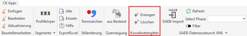 Um ein Koordinatengitter zu erzeugen, rufen Sie in der Multifunktionsleiste, Registerkarte CK Apps, Gruppe Koordinatengitter, den Befehl Erzeugen auf. Zu beachten ist dabei, dass die Funktion nur in den Layouts nutzbar ist.