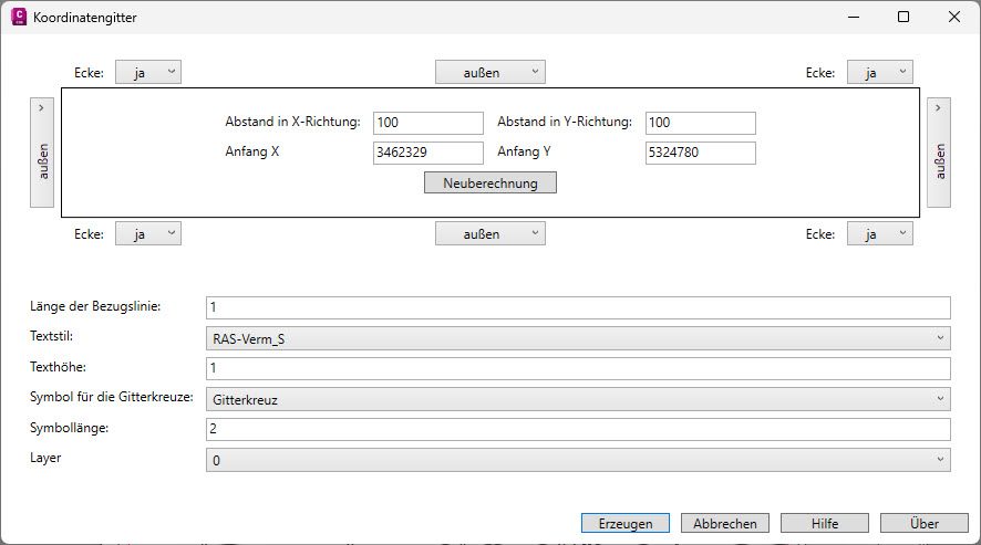 Anschließend wählen Sie ein Ansichtsfenster und das Dialogfeld Koordinatengitter wird angezeigt. Hier legen Sie die Werte für die Darstellung des Koordinatengitters sowie der Beschriftungen an den Blattecken und den Blattseiten fest.