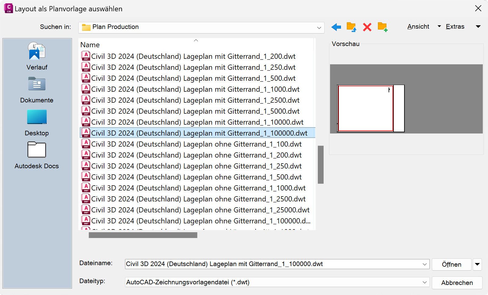 Wenn Sie den Befehl Planrahmen erstellen verwenden, um automatisiert Planrahmen entlang einer Achse zu erzeugen, stehen Ihnen mit der Installation des Country Kit verschiedene Vorlagen zu Verfügung. Für Lagepläne gibt es zwei Versionen: mit Gitterrand und ohne Gitterrand. Möchten Sie die Funktion Koordinatengitter aus dem Country Kit nutzen, benötigen Sie die Vorlagen mit Gitterrand. Diese enthalten Layouts mit einem breiteren Blattrahmen, in dem das Koordinatengitter eingefügt werden kann.