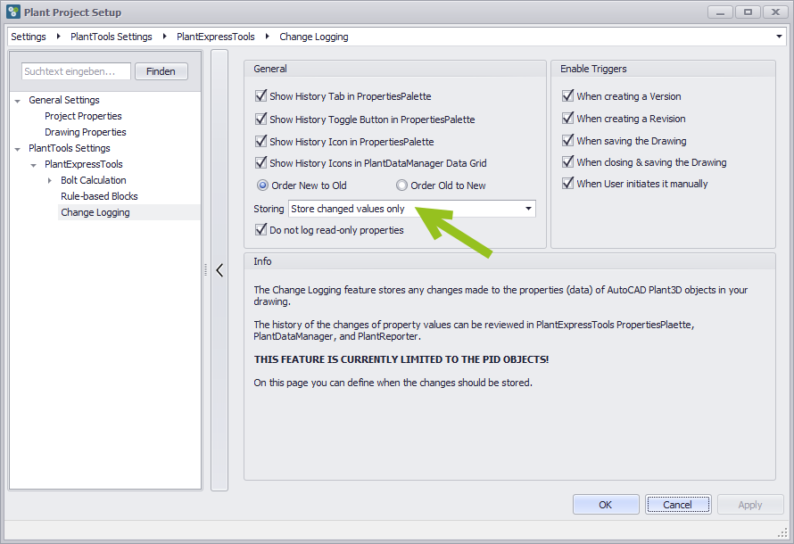 Zum Aktivieren müssen Sie unter „Storing“ auf „Store changed values only“ umschalten. Diese Einstellungen finden Sie im PlantProjectSetup von PlantExpressTools.