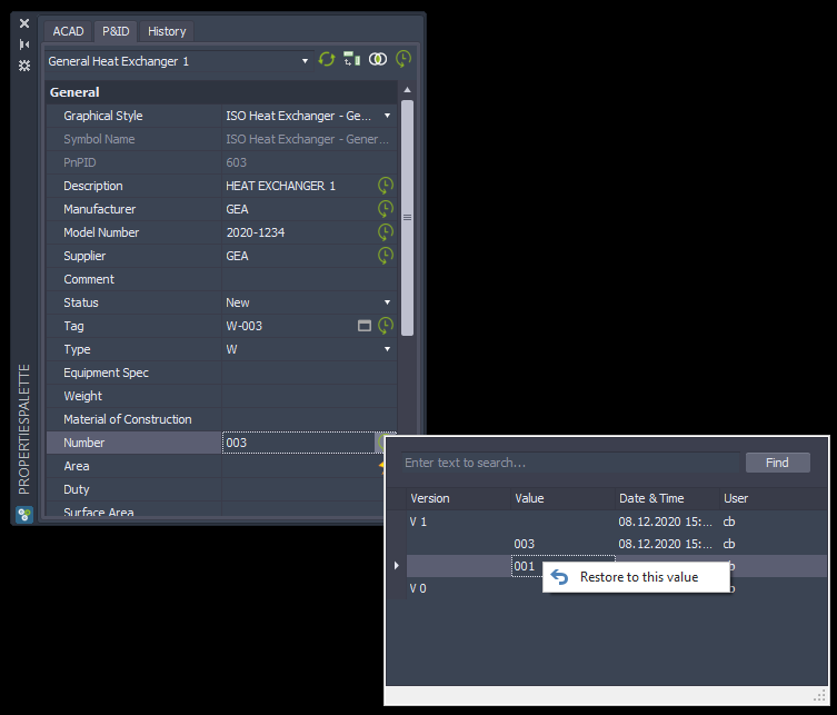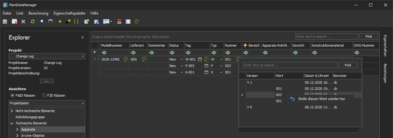 Bei der Änderungsprotokollfunktion werden alle Änderungen in den Eigenschaften der P&ID Symbole und Leitungen in eine Änderungsprotokoll Datenbank geschrieben.
