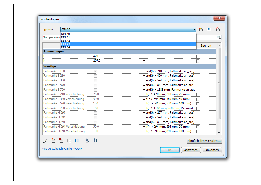 Folgende Verbesserungen und Anpassungen haben wir durchgeführt: Der Rahmen ist als Revit 2016 Familie erstellt, kann also ab Version 2016 aufwärts verwendet werden. Als Familientypen sind die gängigen DIN-Formate definiert: