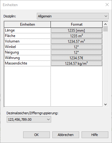 Hier finden Sie abgesehen von der Projekteinheit (Meter, Millimeter, oder Zentimeter, etc.) auch die verschiedenen Einheiten für die Angaben von Flächen, Volumen, Winkel, Neigung, Währung und Massendichte.