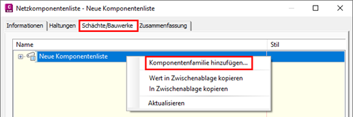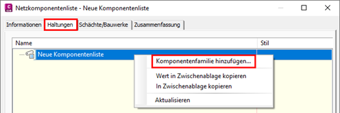 • Auf die Registerkarte Haltungen bzw. Schächte/Bauwerke wechseln und über das Kontextmenü den Befehl Komponentenfamilie hinzufügen ausführen.
