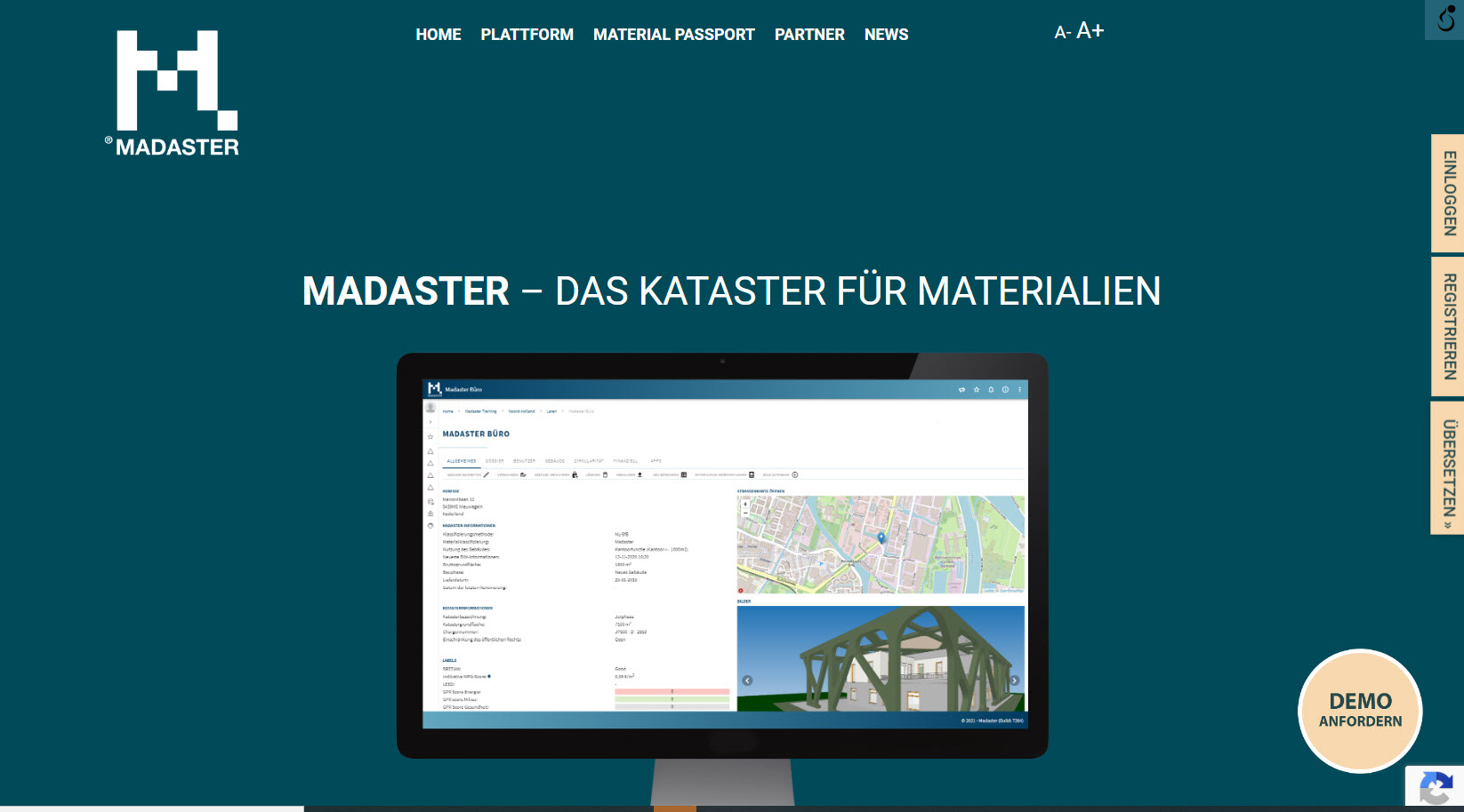 Madaster ist die globale Online-Plattform, die den zirkulären Einsatz von Produkten und Materialien in der Bauwirtschaft ermöglicht. Die Plattform existiert bereits in den Niederlanden, der Schweiz, Norwegen, Belgien und Deutschland. Sie bietet Immobilieneigentümern und weiteren Stakeholdern die Möglichkeit, Daten ihrer Immobilien zu speichern, zu verwalten, anzureichern und auszutauschen. Gleichzeitig können weitere Dokumente (z. B. Energieausweise, Versicherungspolicen, Bilder, Zertifikate) in einem Dossier (Datenraum) abgelegt werden. Das Dossier ist ein zentraler Ort für die standardisierte und einfache Archivierung und Nutzung von gebäudebezogenen Dokumenten. Außerdem enthält das Dossier auch alle durch Madaster automatisch generierten Material Passports eines Gebäudes.