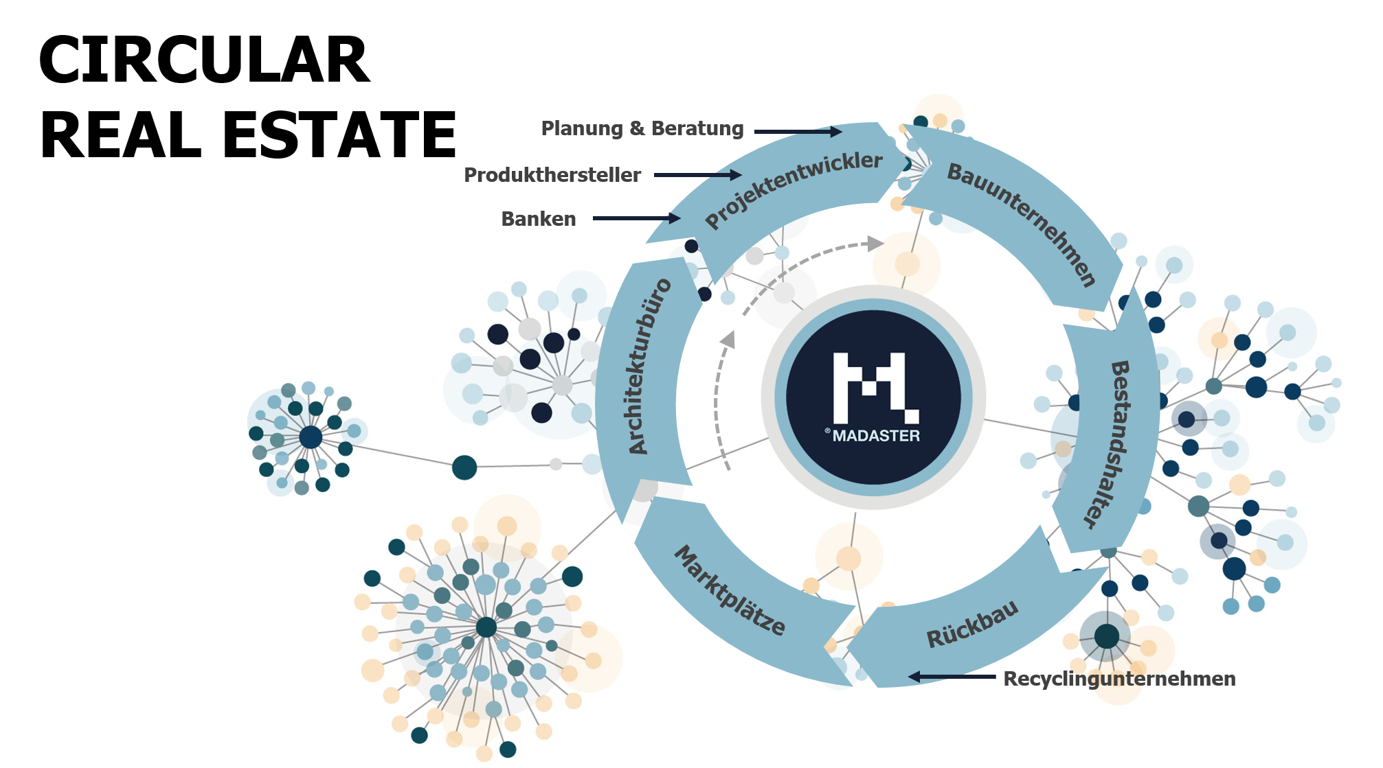 Der große Mehrwert der Madaster-Plattform liegt aber nicht nur in der Plattform an sich, sondern in dem umfangreichen Ökosystem, welches durch Nutzer generiert wird. Es findet ein Austausch zwischen Banken, Architekten, Bauunternehmen, Bestandshaltern, Herstellern und Rückbauern sowie Vereinen, Verbänden und der Forschung statt.