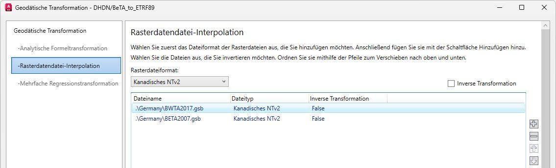 Im folgenden Dialogfeld in der linken Spalte auf den Abschnitt Rasterdatendatei-Interpolation wechseln und das Fenster breiter ziehen, so dass die Schaltflächen am rechten Rand sichtbar werden. Das Rasterdateiformat auf Kanadisches NTv2 umstellen. Anschließend über die Schaltfläche mit dem Plus die benötigte Transformationsgitterdatei wählen und mit den Pfeiltasten die Reihenfolge so festlegen, dass die Datei an erster Stelle steht.