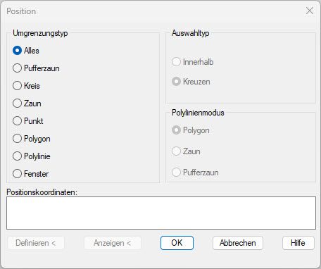 Anschließend in der Abfragebibliothek durch Doppelklick auf Aktuelle Abfrage eine Abfrage starten. Als Abfragetyp Position… wählen und im sich öffnenden Dialogfeld bei Umgrenzungstyp Alles aktivieren. Das Dialogfeld Position mit OK schließen und bei der Definition der Abfrage den Abfragemodus Zeichnen aktivieren. Danach die Abfrage ausführen.