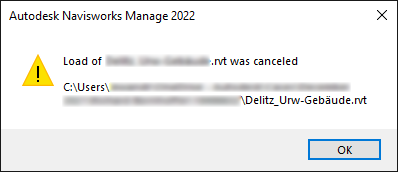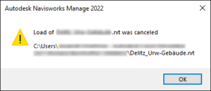 Es kann jedoch zu Kompatibilitätsproblemen kommen, wenn ein Revit-Modell in einer älteren Version als Navisworks gespeichert wurde. Ein auftretender Fehler, der dann beim Öffnen eines Revit-Modells in Navisworks auftritt, ist die Fehlermeldung “Das Laden von [Dateiname].rvt wurde abgebrochen”.