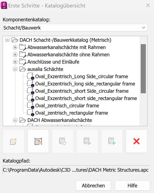 3. Erstellen Sie im Civil3D Installationspfad für die Kabelkataloge (C:\ProgramData\Autodesk\C3D 2024\deu\Pipes Catalog\DACH Metric Structures) einen neuen Ordner (z.B. auxalia_Schächte).
