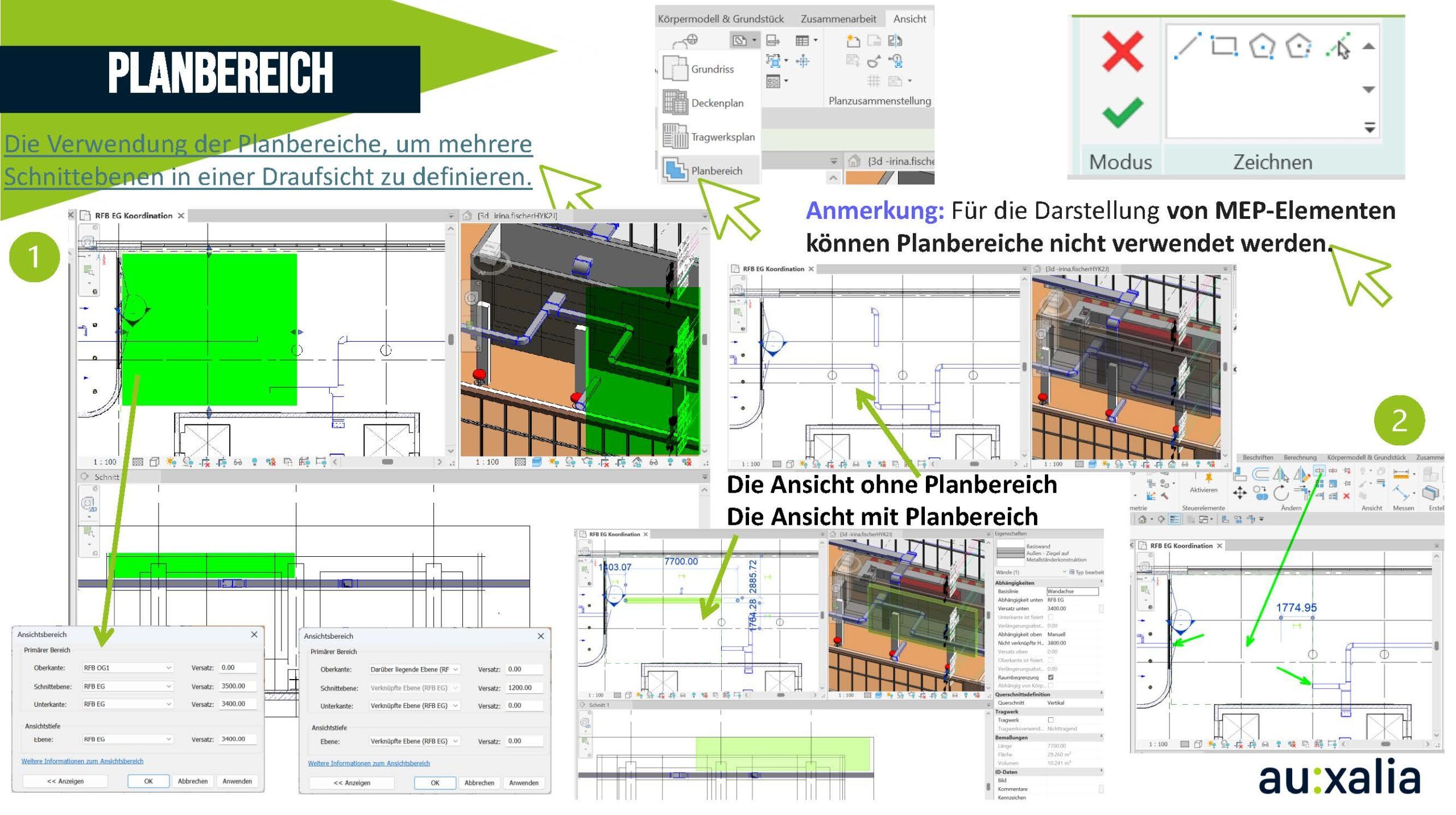 Durch die Verwendung von Planbereichen kann man innerhalb einer Draufsicht steuern, welche Elemente sichtbar sind und wie sie geschnitten werden. Dies ist besonders hilfreich, um eine klar strukturierte und technisch korrekte Darstellung in Plänen zu gewährleisten.