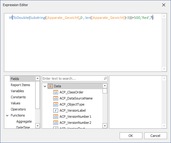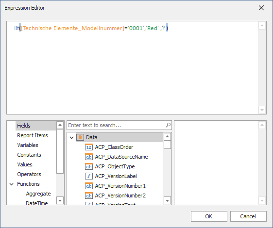 In dem Beispiel zeigen wir, wie zum einen die Hintergrundfarbe gesetzt wird, wenn die Modellnummer 0001 ist. Im zweiten Beispiel wird das Gewicht eingefärbt, wenn es > 500 kg ist.