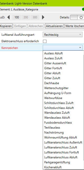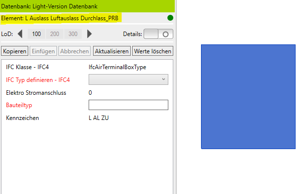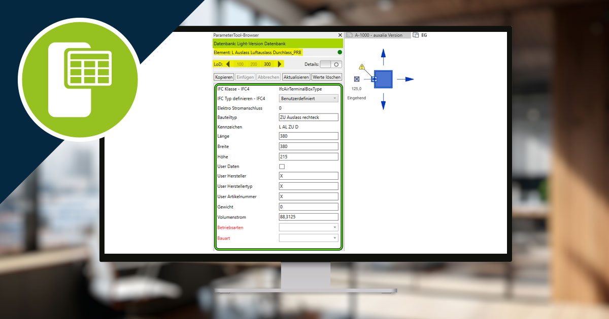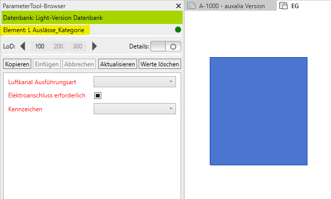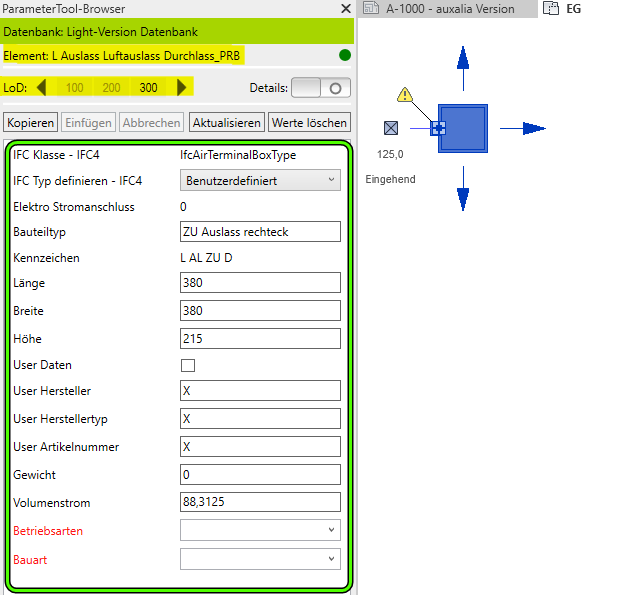 Durch Anwählen der Bauteile im Projekt werden diese vom ParameterTool nach den vordefinierten Regeln einer Definitionsdatei, die in der Light-Version fix und kompatibel mit der ProjectBox ist, identifiziert und mit den dazugehörigen LOD-basierten Parametern angezeigt.