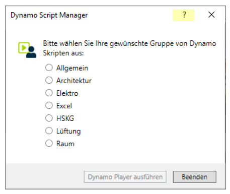 Revit ProjectBox liefert eine umfangreiche Sammlung von allgemeine und gewerkespezifische Skripten. Je nach Anwendungsfall oder Gewerk können Sie über den Dynamo Skript Manager und die Wahl der Kategorien auf die Skripte zugreifen und der Dynamo Player wird geöffnet.