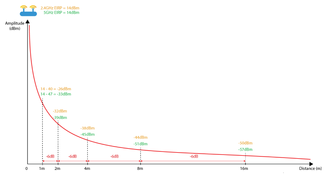 FSPL ist nicht auf Wi-Fi-Wellen beschränkt, sondern kann auch auf alle anderen Wellen mit anderen Frequenzen angewendet werden. In einer Wi-Fi-Umgebung bezieht sich FSPL auf die Menge an Leistung, die ein Wi-Fi-Signal verliert, wenn es sich vom Sender entfernt (das kann ein Access Point sein).