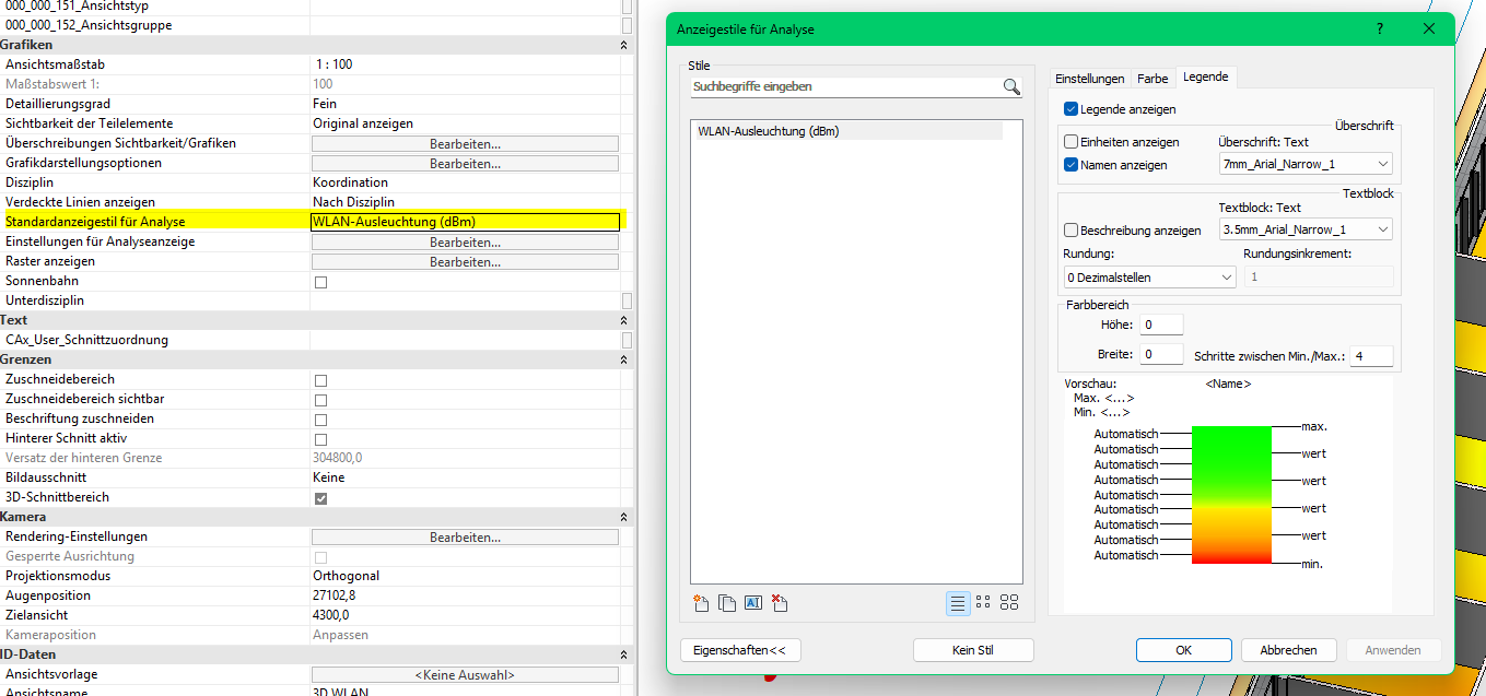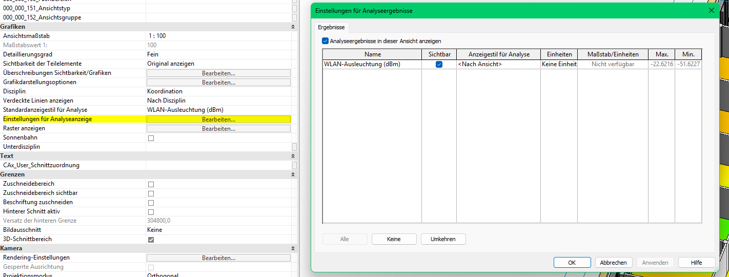 Auf Basis der gewählten Revit Objekten bzw. Quellen wird eine farbliche Analyse auf einer Fläche erstellt. Somit, wenn die Access Point Familien gewählt sind, können Sie die WLAN-Ausleuchtung (ohne Störungen und Reflexionen und Dämpfungen von baulichen Elementen) simulieren und die Ergebnisse auf einer Fläche in einer Revit Ansicht darstellen lassen.