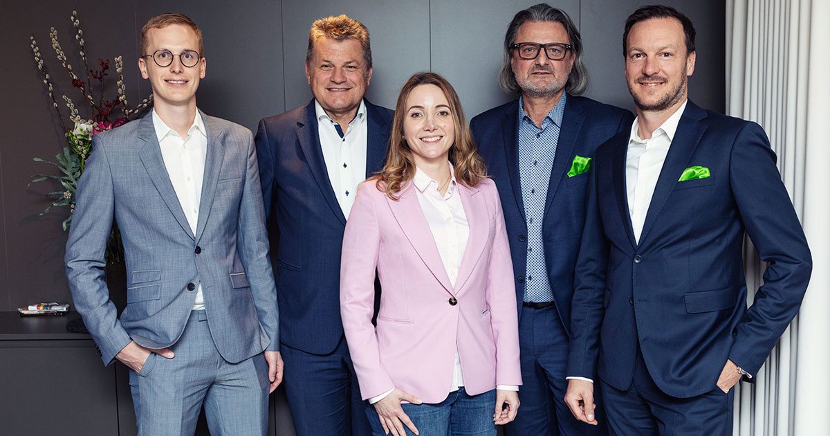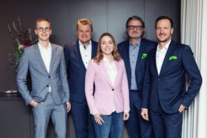 Hamburg/München 05.04.2023 – Das neue auxalia Gesellschafter-Team (v.l.n.r.): Benjamin Hubner (Sophora), Bernd Schlenker (auxalia), Jennifer Regehr (Sophora), Carsten Dohrmann (auxalia), Andreas Hofherr (Geschäftsführer auxalia)