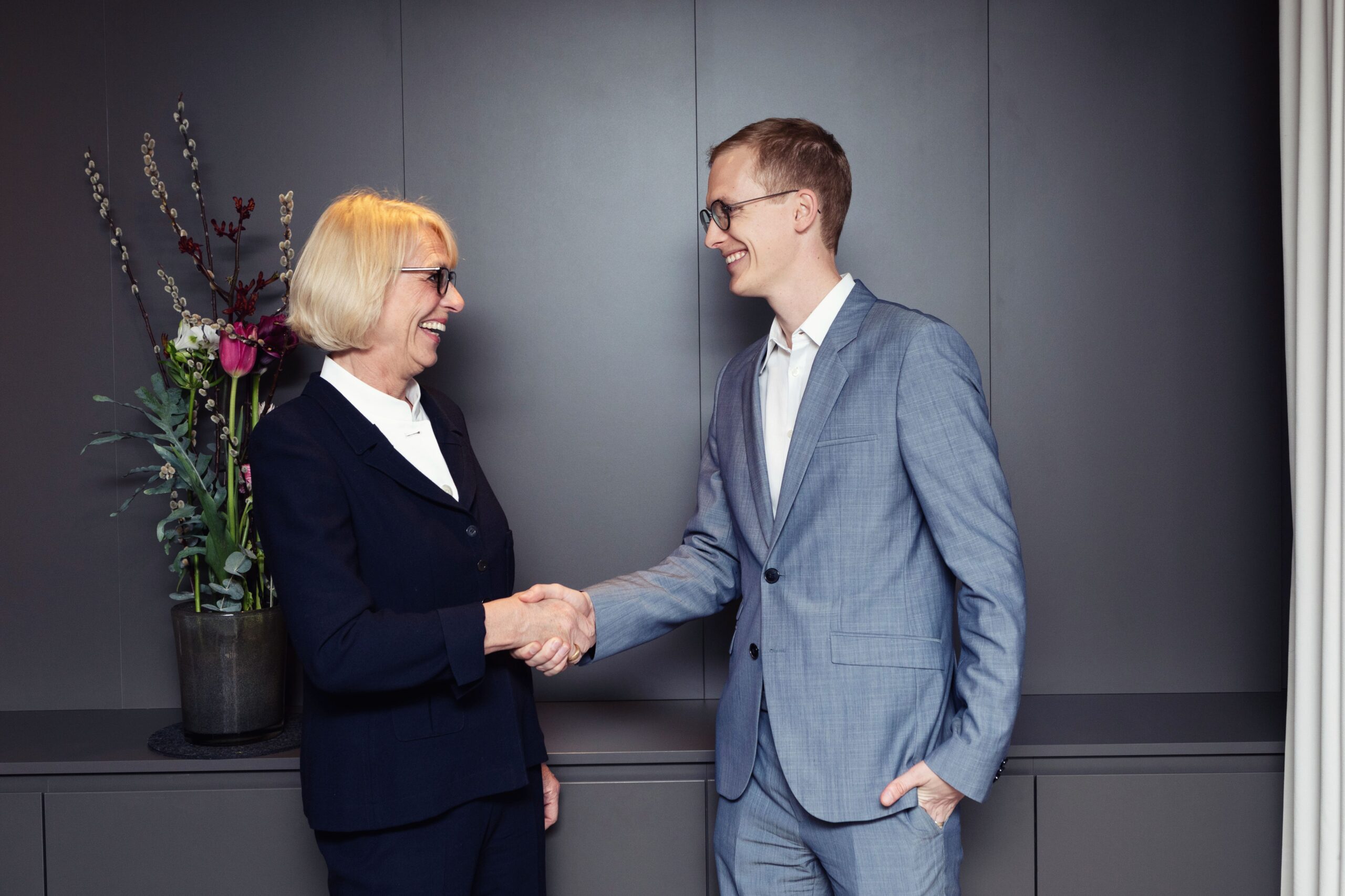 Die scheidende auxalia Geschäftsführerin und Gesellschafterin Bärbel Maempel begrüßt den neuen Gesellschafter und Sophora Geschäftsführer Benjamin Hubner