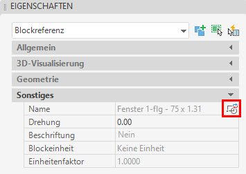Zusätzlich wurde in der Palette Eigenschaften eine Schaltfläche ergänzt, die zu sehen ist, sobald ein Block ausgewählt ist.