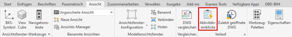 Die Palette Aktivitätseinblicke ist in der Multifunktionsleiste, Registerkarte Ansicht, Gruppe Verlauf zu finden.