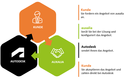Mit der Umstellung wird das gesamte Geschäftsmodell des Kaufprozesses deutlich vereinfacht. Kunden fordern ein Angebot über auxalia an, erhalten das konfigurierte Angebot direkt von Autodesk per E-Mail, nehmen es aktiv an und tätigen die Zahlung ebenfalls direkt bei Autodesk. auxalia bleibt weiterhin der Hauptansprechpartner für Lizenzen, Beratung, Schulung und Support, während Autodesk den Transaktionsprozess verwaltet. Diese Änderung ermöglicht es Autodesk, eine direkte Erfahrung und Ansprache mit Ihnen als Kunde zu erhalten und Sie auf dem weiteren Weg in eine zentrale Plattform und Service besser zu begleiten.
