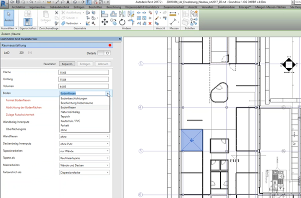Das Tool öffnet ein separates Fenster für die Eingabe und bietet die passenden Parameter an. Dabei ist die Auswahl intelligent und kaskadierend. So lässt z.B. bei der Raumbemusterung die Auswahl des Bodenbelags Parkett nur noch fünf weitere Parameter zu bzw. drei beim Bodenbelag Teppich. Dadurch wird die Qualität gesteigert, da keine falschen Werte möglich sind. Parameter des ParameterTool sind in Revit gesperrt und können nur bewusst geändert werden, wodurch Fehler vermieden werden. Nacharbeiten werden erheblich reduziert und die Übersicht optimiert, da sofort sichtbar ist, was noch fehlt. Zudem bedeutet das Kopieren von bestehenden Informationen gleicher Bauteile eine erhebliche Arbeitserleichterung.