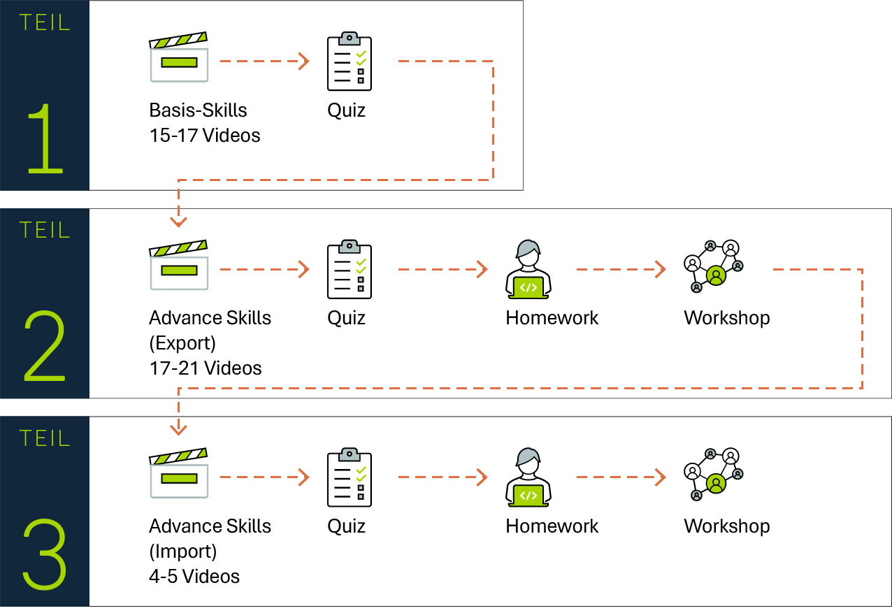 Das eTraining-Seminar gliedert sich in drei aufeinander aufbauende Lernblöcke. Jeder Block besteht aus Skills (Video-Lerneinheiten und Dokumente), Quiz (interaktiven Übungen), Homework und schließt jeweils mit einem Online-Workshop ab.